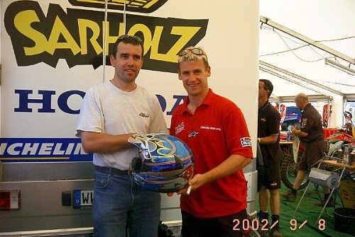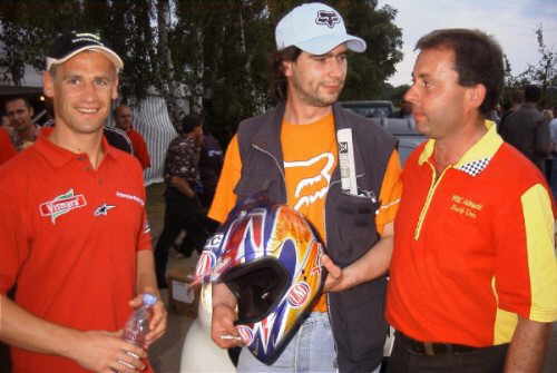 Mario Schubert aus Suhl hat den original Helm von Joel Smets ersteigert. Die Geschichte, warum Marion anschliessend mit einem Auto vom DRK chauffiert wurde, möchte ich den armen Lesern lieber ersparen. (und auch dem